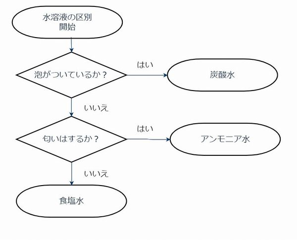 例えば食塩水、炭酸水、アンモニア水の3種類の水溶液があり、与えられた情報から見分けなさいという問題があったとします。この場合どうすれば見分けられるのかフローチャート風に表してみると、