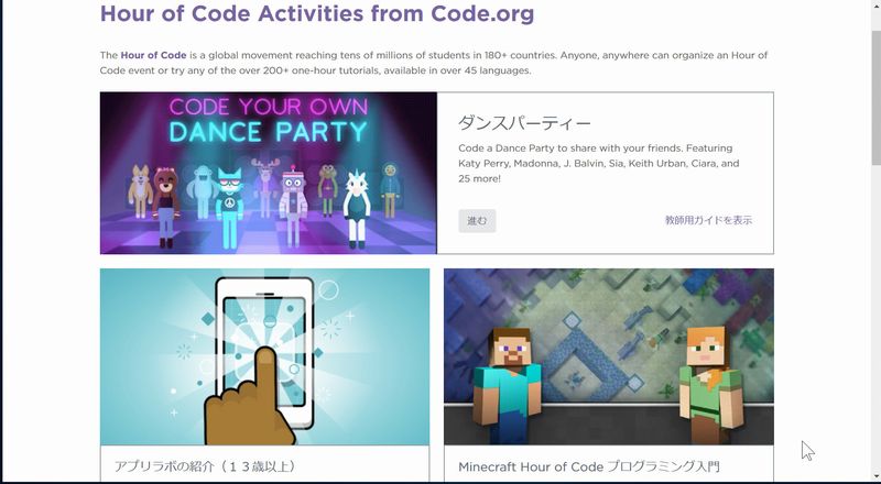 code.orgは2013年に始まった世界の初等・中等教育機関でコンピューターサイエンスを学ぶカリキュラムを提供する非営利団体です。そのサイトではScratchに基づいたビジュアルプログラミング言語を使ってコーディング(プログラミング)を学ぶことができます。年齢層別のチュートリアルなどもありますが、小学校高学年でとにかく体験してみるにはHour of Codeからでいいかと思います。
